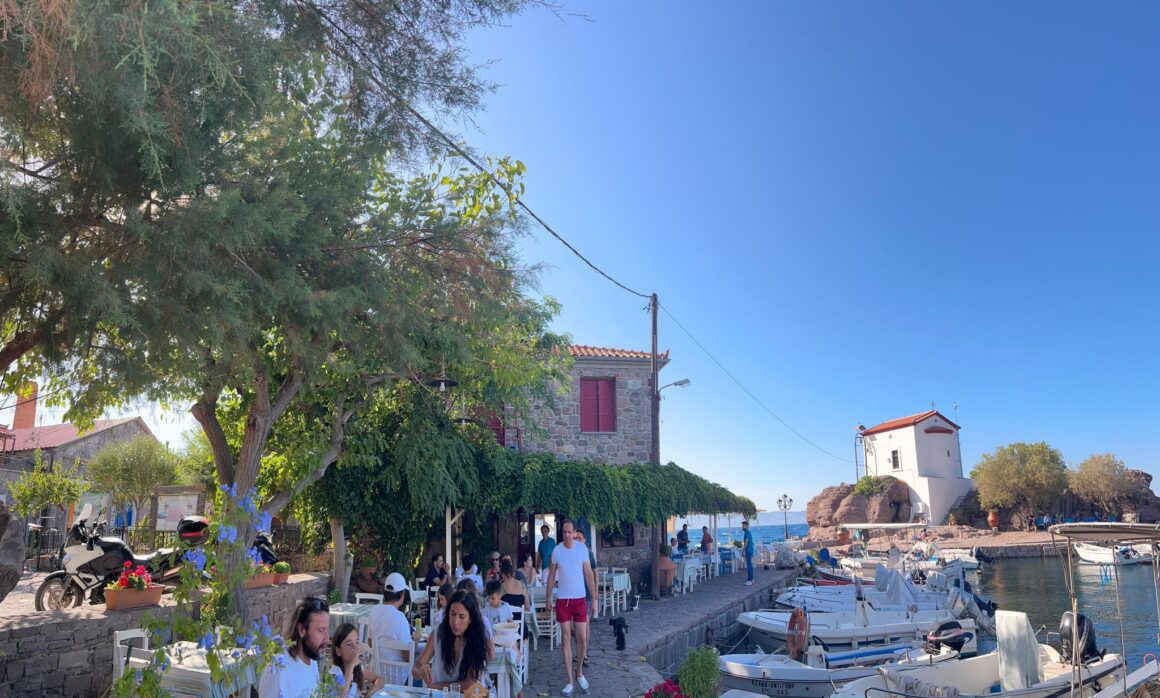 Biz de Stratis gibi KAVOS (ΚΑΒΟΣ) kahvesinde, asırlık dut ağacının altına oturuyoruz. Kim bilir belki de yazarın oturduğu masadayız. Yazarın gözünden bakıyoruz Deniz Kızı Panagia Şapeli’ne.