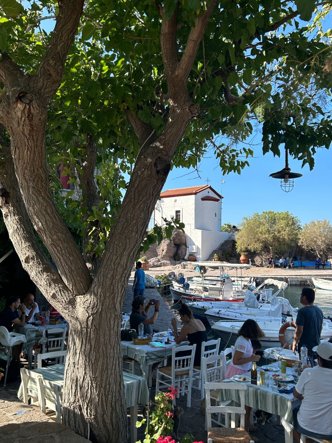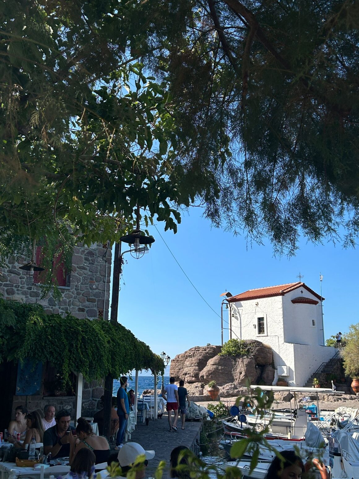 Biz de Stratis gibi KAVOS (ΚΑΒΟΣ) kahvesinde, asırlık dut ağacının altına oturuyoruz. Kim bilir belki de yazarın oturduğu masadayız. Yazarın gözünden bakıyoruz Deniz Kızı Panagia Şapeli’ne.