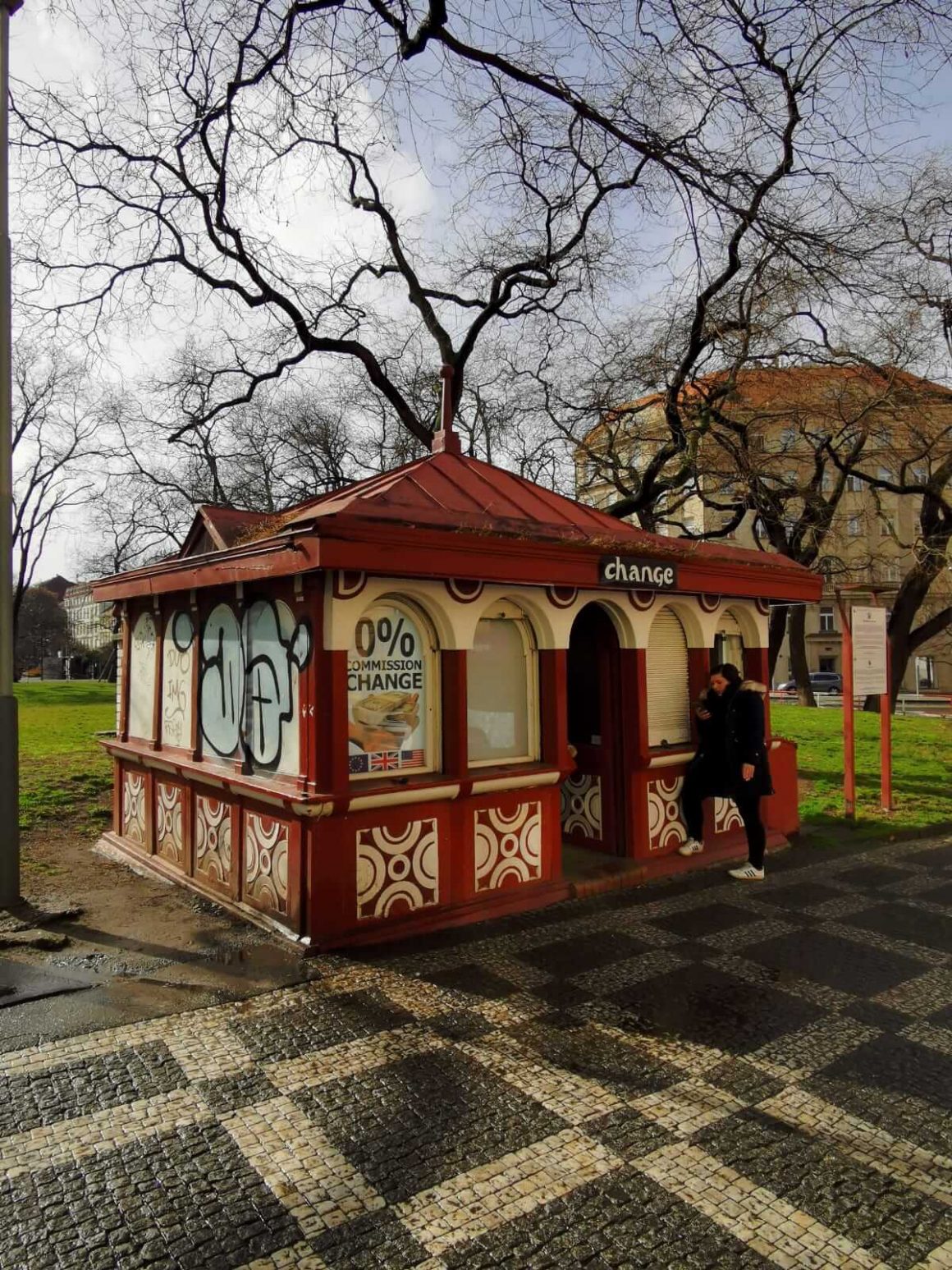 1920’li yıllarda inşa edilen, gazete başta olmak üzere, sigara, içki satan, bugün döviz büfesi olan ve içinde aynı anda 2-3 kişinin zor hareket edebileceği ahşap, farklı şekil ve renkteki büfe Çek Ulusal Mirası listesinde yer alır. 1980 yılında Belediye Meclisi büfenin yıkılmasına karar verir. Yıkıma karşı olanların, bu eserin ünlü mimar Pavel Janak veya Josef Gocar tarafından yapıldığı, Rondo (yeni) Kubizm mimari akımının önemli örneklerinden olduğu iddiaları toplumda geniş yankı uyandırır. Yıkım durdurulur ve ulusal miras kabul edilir. Büfenin yanında bulunduğu park, sık sık rastlanan soygunlardan dolayı Praglılarca Sherwood Ormanı diye anılmaktadır. İlginç olan ise binanın bahsi geçen iki önemli mimardan birinin eseri olduğu bugün bile tartışma konusudur. Büfeye en yoğun ilgi Çek grafiticilerince gösterilir. Buraya kadar gelmişken, parkın diğer ucunda bulunan ve kentin giriş kapılarından biri olarak da kullanılan yeni Belediye Meclisi binasını da görmeden geçmemek gerekir. Belediye Meclisi duvarında Bohemya bölgesindeki ticarette metrenin esamesi okunmadığı günlerde kullanılmış (1268-1765) olan uzunluk ölçüsü cubit (591.4 mm)’in standartını gösteren cetveldir. Bu arada küçük bir hatırlatma; yeni ifadesi sizi yanıltmasın zira; Yeni Prag (Nove Mestro) diye bilinen bölge 1348 yılında, Bohemya Kralığı’nın altın çağı olarak anılan dönemde IV. Charles tarafından kurulmuş.