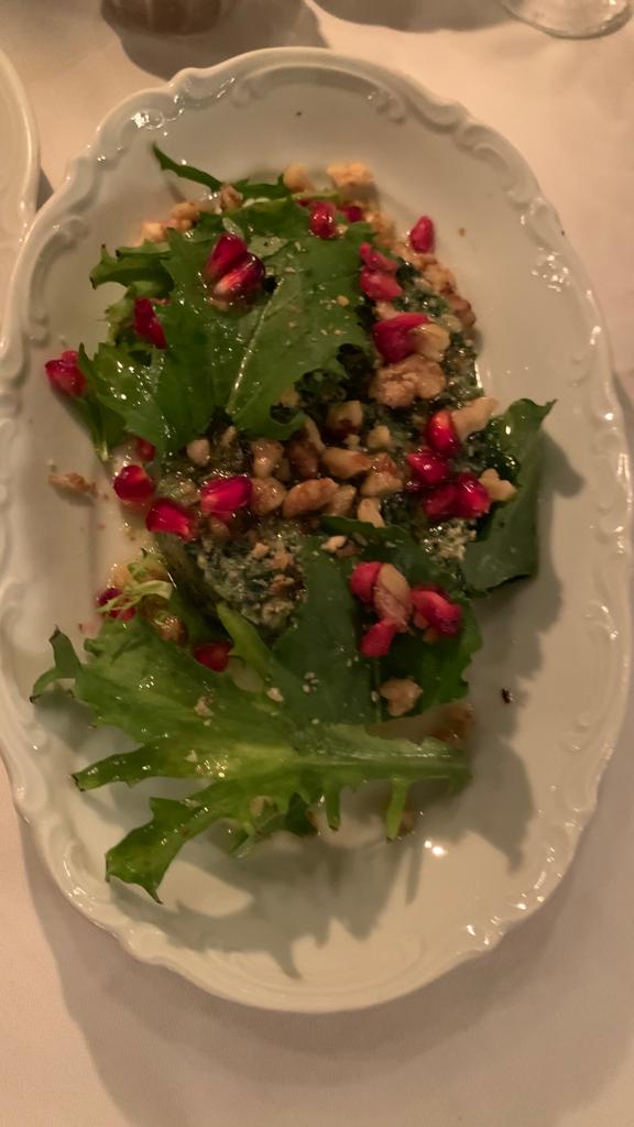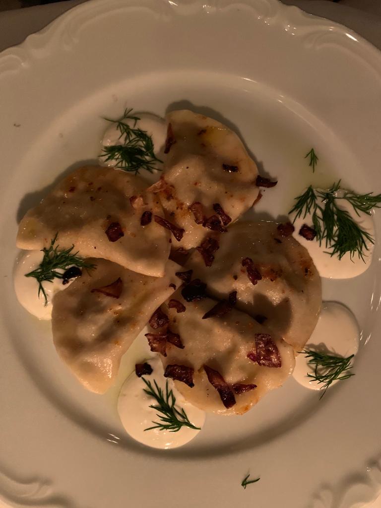 Yemeğe Izgara Patlıcan Sarma ile başladık. Cevizli keçi peyniri sarılmış patlıcan sarmalar oldukça yavandı. Tatmayanlar kesinlikle bir şey kaçırmış sayılmaz. Devamında Ispanak Pkhali denilen, nar, labne, muskat, ceviz ve ıspanak yaprakları ile yapılan bir salata tattık. Et sevmeyenler için kesinlikle tavsiye olunur. Ardından gelen Rus mutfağının klasik çorbası Borç Çorbası ise isteğe bağlı olarak dana kaburgalı veya sebzeli olarak iki farklı versiyonda sunuluyor. Sevdiğim bir çorba olsa da, bugüne kadar tattıklarım içinde harcıalem kategorisindeydi. Ana yemek olarak da, Kuzu Ciğer, Süt Dana Şinitzel ve Pırasa, Porçini Mantarlı Rus Mantısı Pelmeni’yi denedik. Ciğer yumuşacık, Şinitzel ise çıtır çıtırdı. Pelmeni ise mutlaka denenmeli. Rus lokantası klasiklerinden olan Sarı Votka ise maalesef beklentileri karşılamaktan uzaktı.